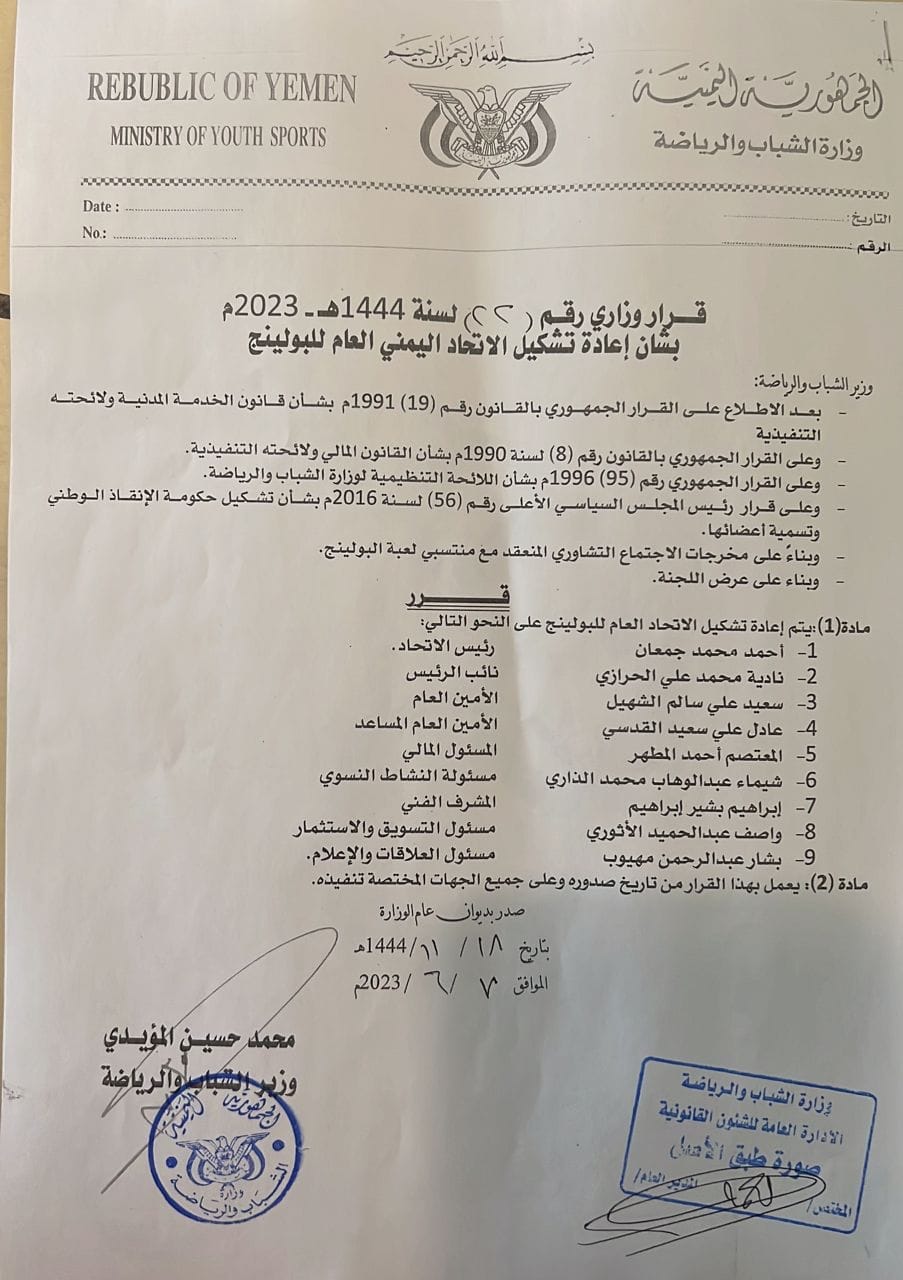 يتقدم الأستاذ أحمد جمعان رئيس الإتحاد العام للبولينج و بالنيابة عن أعضاء مجلس الإدارة وجميع لاعبي و متتسبي الإتحاد بالشكر الجزيل لمعالي الأستاذ محمد حسين المؤيدي وزير الشباب و الرياضة على منح أعضاء مجلس إدارة الإتحاد الثقة الكبيرة يإصدار قرار بتشكيل مجلس إدارة الإتحاد و على إستمرار تشجيعه و تحفيزه و دعمه الكبير للإتحاد